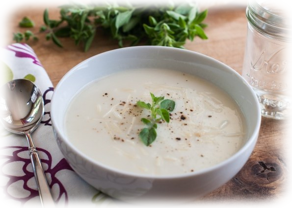 5½ cups cauliflower florets ½ cup diced onion 2 Tbsp butter2 tsp all-purpose flour 1 cup milk or half & half 1 tsp salt & dash of pepper2 cups Chicken Broth (or 1 packet instant chicken broth seasoning mix in 2 cups of water)ground nutmeg (optional)Directions:In a 4-quart saucepan, combine cauliflower, water, and salt; bring to a boil. Reduce heat and simmer until cauliflower is tender; let cool slightly. Transfer 2 cups cauliflower (including cooking liquid) to blender container and process until smooth; transfer to a large bowl and repeat procedure until all cauliflower and liquid have been processed. Set aside. In same saucepan, heat butter over medium-high heat until bubbly and hot; add onion and sauté until translucent. Sprinkle with flour and broth mix and stir quickly to combine; cook, stirring for 1 minute. Gradually add milk and cook, stirring constantly until flour mixture is completely dissolved and liquid thickens; stir in pureed cauliflower. Reduce heat and let simmer, stirring occasionally until cauliflower is heated; stir in pepper. Ladle into 4 soup bowls and, if desired, sprinkle each portion with dash of nutmeg.