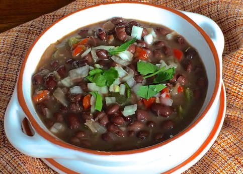 Cuban Black Bean Soup(From Sunset Vegetarian Cookbook)(Makes 6 Servings)2 medium green bell peppers (seeded, and finely chopped)5 large garlic cloves, minced or pressed 2 medium onions finely chopped6 cups cooked and rinsed black beans 3 cups vegetable stock4 Tbsp olive oil 2 Tbsp white vinegar1½ tsp ground cumin 1½ tsp oregano leavessalt to taste pepper to tasteMarinated Rice (recipe follows)Directions:Prepare marinated rice (recipe follows) and set aside for at least 1 hour or until the next day; bring to room temperature before serving.Marinated Rice:Thinly slice 3 green onions (including tops). Combine with 2 cups of cooked white rice, 1 finely chopped tomato and 3 Tbsp each of olive oil and white vinegar. Cover and chill.Soup:Heat oil in a 5-quart saucepan over medium heat. Add the onions, green bell peppers and garlic; cook, stirring until limp.