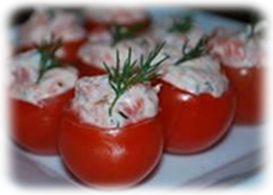 36 cherry tomatoes 2 (8 oz) pkgs softened cream cheese*2 Tbsp chopped fresh chives 2 (4 oz) pkgs Norwegian smoked salmon*dash of Worcestershire Sauce small amount of chopped chives* This recipe can be altered based on strength of salmon desired. I have made this recipe 2 parts cream cheese to 1 part smoked salmon as a nice blend for the average person. Try starting with less salmon and increasing a little at a time to taste.Directions:Wash and stem the cherry tomatoes. Hollow out the centers with a serrated grapefruit spoon. Turn tomatoes upside down on paper towels to drain for about 15 minutes. With a fork, mix softened cream cheese and smoked salmon until well blended and smooth. Add a dash of Worcestershire Sauce and chopped chives; blend mixture smoothly. Fill the cherry tomatoes with desired amount of filling and chill for at least 15 minutes before serving.