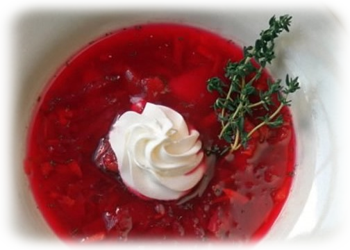 2 cups coarsely shredded red cabbage 2 large carrots, diced or shredded1 small onion, chopped 3 medium beets w/ leafy tops6 cups vegetable stock ¼ cup lemon juice2½ Tbsp sugar ½ tsp dill weed2 Tbsp salad oil salt and pepper to tasteabout ½ cup sour creamDirections:Cut off beet tops; discard stems and any wilted leaves. Use kale if beet leaves are not available. Coarsely chop the leaves. Peel the beets and shred coarsely.Heat oil in a 5-quart pot over medium heat. Add onion and carrots and cook, stirring occasionally until vegetables are soft (about 10 minutes).Add beets and tops, cabbage, lemon juice, sugar, dill weed, and stock; bring to simmering. Reduce heat to low; cover and simmer until beets and cabbage are tender (about 45 minutes). Season with salt and pepper to taste. Garnish with sour cream.
