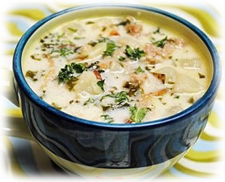 (2) 10¾ oz cans (condensed potato soup)(1) 16 oz can chicken broth (full strength)2 cups of milk 1 medium/large onion, chopped ½ lb ground Italian sausage¼ tsp crushed red pepper 3 Tbsp butterDirections:1/3 package thawed frozen chopped kale or chopped collard greensSimultaneously:-- In a 2 quart pot, saute onion and red pepper in butter until tender (do not overcook)-- In a skillet, brown sausage. Keep it "loose" and drain grease after cookedCombine:Add potato soup, chicken broth, milk, sausage and onions in pot. Heat on low/medium heat until hot (not boiling). Add thawed frozen kale or collard greens. Turn heat down and simmer for about 15 to 20 minutes. Salt and pepper to taste.